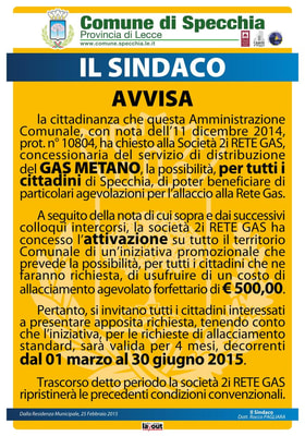 Il comune di Specchia ha attivato insieme alla società 2i Rete Gas un'inziativa promozionale per tutti i cittadini di Specchia che prevede la possibilità di usufruire di uno sconto di allacciamento agevolato alla rete gas di € 500,00 dal 01 Marzo al 30 Giugno 2015.