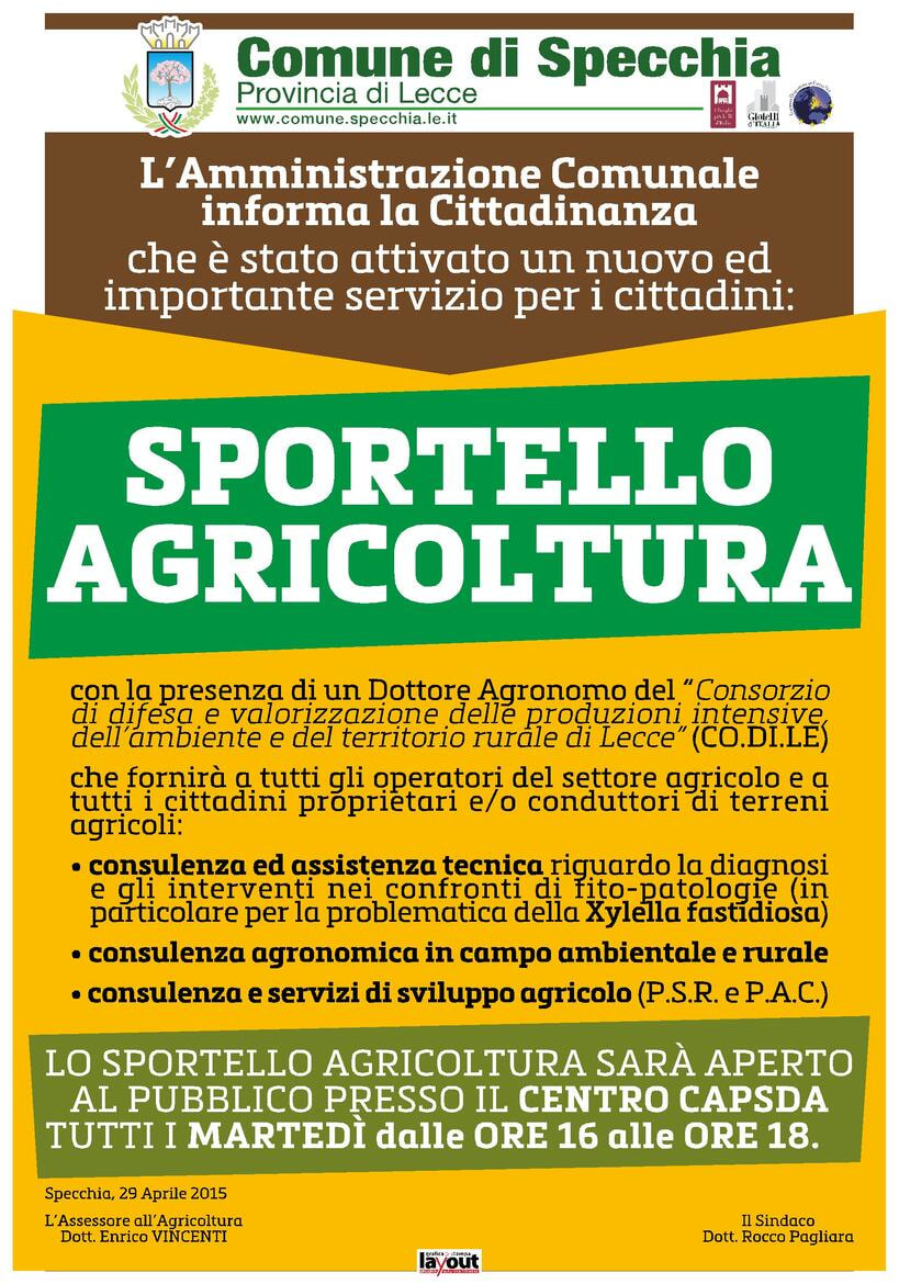 L'Amministrazione Comunale informa la Cittadinanza che è stato attivato un nuovo ed importante servizio per i cittadini, presso il nostro Comune è stato infatti istituito uno SPORTELLO AGRICOLTURA, che vedrà la presenza di un Dottore Agronomo del "Consorzio di difesa e valorizzazione delle produzioni intensive, dell'ambiente e del territorio rurale di Lecce (CO.DI.LE)", il quale fornirà a tutti gli operatori del settore agricolo e a tutti i cittadini in genere, proprietari o conduttori di terreni agricoli, i seguenti servizi:- consulenza ed assistenza tecnica, riguardo la diagnosi e gli interventi nei confronti delle più comuni fito-patologie (in particolare per la problematica della Xylella fastidiosa);- consulenza agronomica in campo ambientale e rurale;- consulenza e servizi di sviluppo agricolo (riguardo il P.S.R. e la nuova P.A.C.).Lo sportello fornirà assistenza diretta ai produttori, effettuando anche eventuali sopralluoghi in azienda, laddove sussistano problemi di carattere fitosanitario particolari o interessanti ampie zone.Inoltre, verrà svolto un corso di preparazione per il conseguimento o il rinnovo del "Patentino fitosanitario", necessario per l'acquisto e il corretto utilizzo dei prodotti fitosanitari, rivolto agli agricoltori specchiesi.LO SPORTELLO AGRICOLTURA SARA' APERTO AL PUBBLICO PRESSO IL CENTRO CAPSDA TUTTI I MARTEDI dalle ore 16,00 alle ore 18,00.