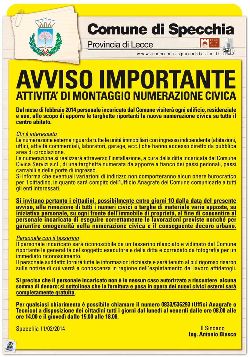 A partire dal mese di Febbraio 2014, il personale incaricato dal Comune visiterà tutte le abitazioni residenziali e non, allo scopo di apporre le targhette riportanti la NUOVA NUMERAZIONE CIVICA su tutto il centro abitato.