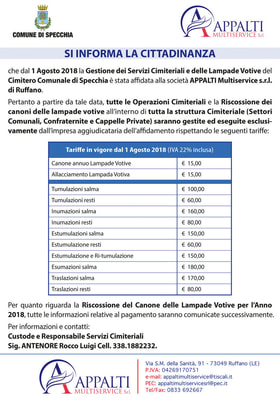 SI INFORMA LA CITTADINANZA CHE A PARTIRE DAL 1 AGOSTO LA GESTIONE DEI SERVIZI CIMITERIALI E DELLE LAMPADE VOTIVE E' STATA AFFIDATA ALLA DITTA APPALTI MULTISERVICE S.R.L. DA RUFFANO (LE).