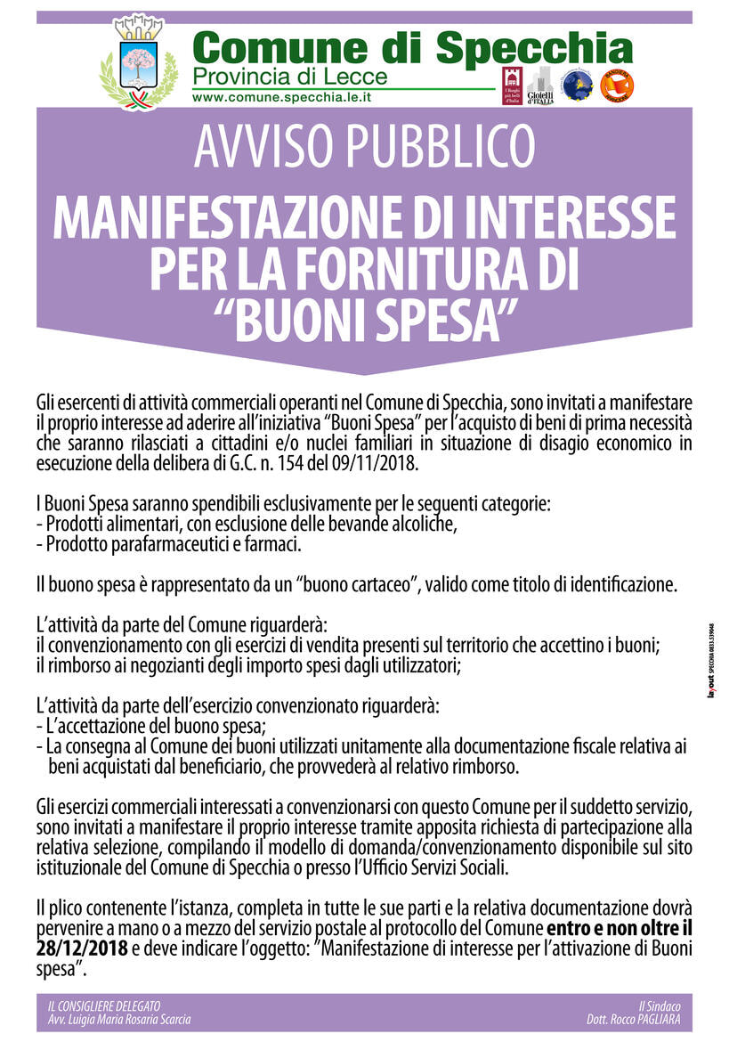 Gli esercenti di attività commerciali operanti nel Comune di Specchia, sono invitati a manifestare il proprio interesse ad aderire all’iniziativa “Buoni Spesa” per l’acquisto di beni di prima necessità che saranno rilasciati a cittadini e/o nuclei familiari in situazione di disagio economico in esecuzione della delibera di G.C. n. 154 del 09/11/2018.