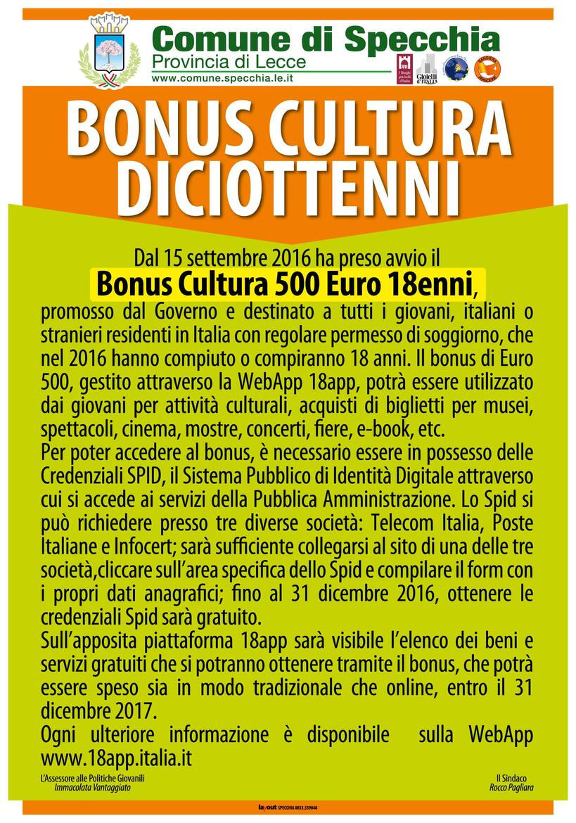 PROMOSSO DAL GOVERNO E DESTINATO A TUTTI I GIOVANI, ITALIANI O STRANIERI RESIDENTI IN ITALIA CON REGOLARE PERMESSO DI SOGGIORNO CHE NEL 2016 HANNO COMPIUTO O COMPIRANNO 18 ANNI. IL BONUS DI EURO 500 GESTITO ATTRAVERSO LA WEBAPP 18APP POTRA' ESSERE UTILIZZATO DAI GIOVANI PER ATTIVITA' CULTURALI, ACQUISTI DI BIGLIETTI PER MUSEI, SPETTACOLI, CINEMA, MOSTRE, CONCERTI, FIERE, ETC...