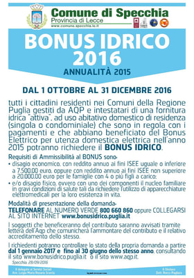 tutti i cittadini residenti nei Comuni della Regione Puglia gestiti da AQP e intestatari di una fornitura idrica “attiva”, ad uso abitativo domestico di residenza (singola o condominiale) che sono in regola con i pagamenti e che abbiano beneficiato del Bonus Elettrico per utenza domestica elettrica nell’anno 2015 potranno richiedere il BONUS IDRICO.