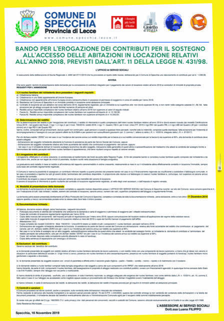 Sono aperti i termini di presentazione delle domande per la concessione di contributi integrativi per il pagamento dei canoni di locazione relativi all’anno 2018 ai conduttori di immobili di proprietà privata.La domanda di partecipazione al bando dovrà essere compilata su apposito modulo disponibile presso L’UFFICIO DEI SERVIZI SOCIALI del Comune di Specchia nonché sul sito del Comune: www.comune.specchia.le.it., con l’indicazione di tutti i dati richiesti ( reddito, estremi del contratto di locazione, canone annuo, numero dei vani, superficie complessiva dell’alloggio) e regolarmente firmata.