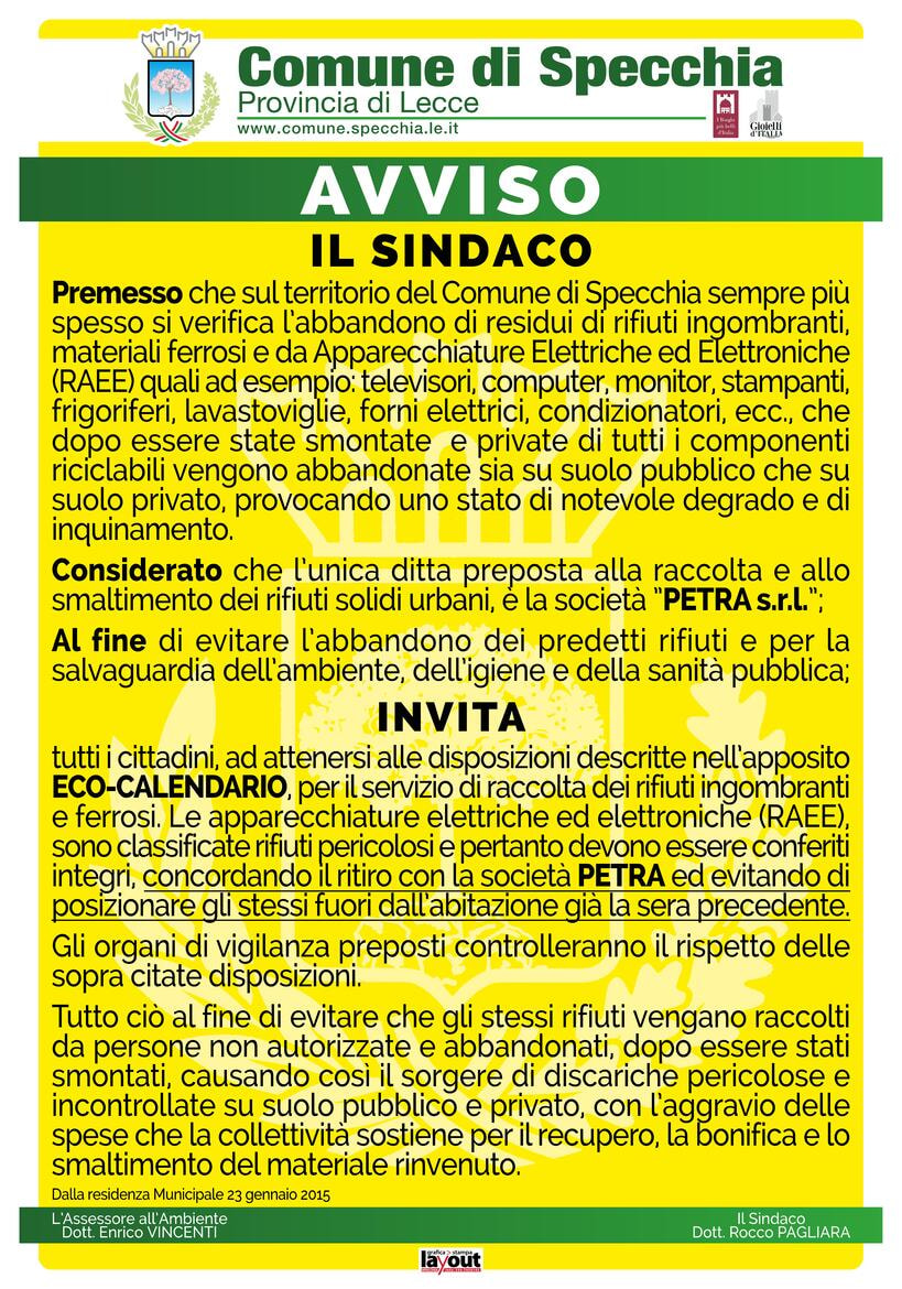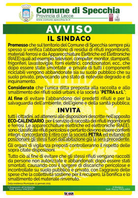 COMUNICAZIONI DEL SINDACO A TUTTI I CITTADINI CIRCA IL SERVIZIO DI RACCOLTA DEI RIFIUTI INGOMBRANTI E FERROSI.