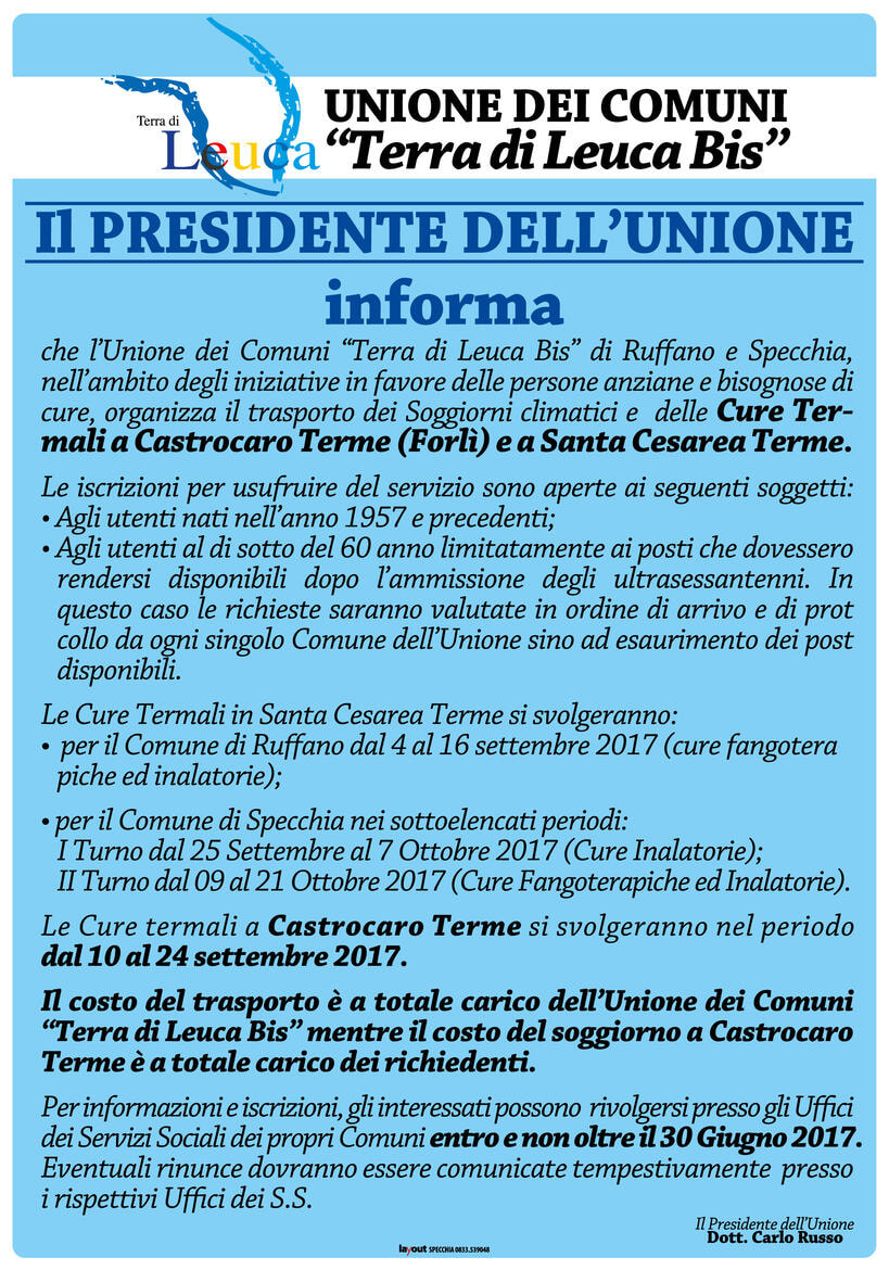 Sono aperte le iscrizioni per usufruire dei servizi che si svolgeranno a Santa Cesarea Terme e a Castrocaro Terme.