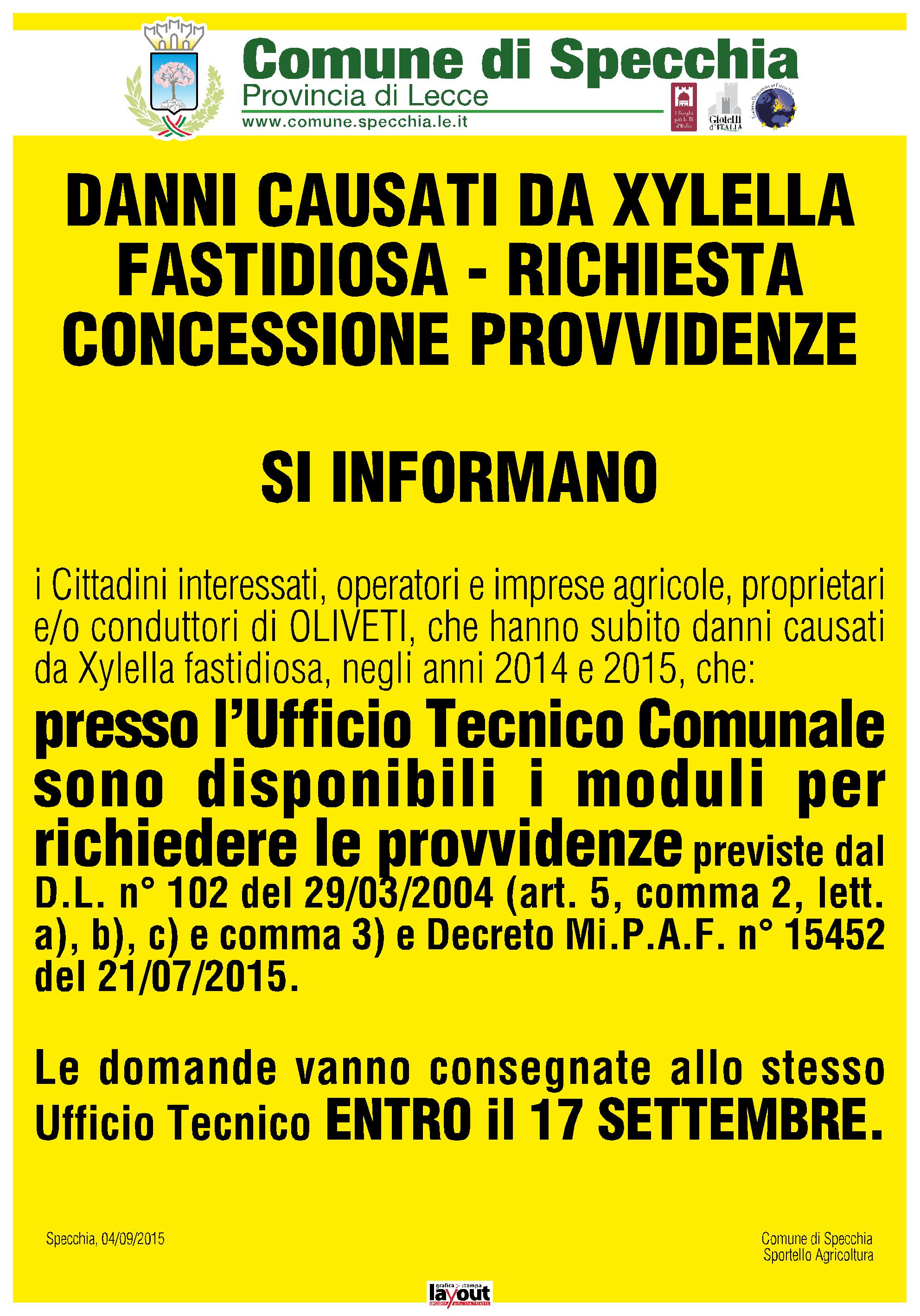 IL MINISTERO DELLE POLITICHE AGRICOLE HA PUBBLICATO IL DECRETO N.15542 DEL 21.07.2015 CON IL QUALE E' STATO DICHIARATO IL CARATTERE DI ECCEZIONALITA' DELLE INFEZIONI DI "XYLELLA FASTIDIOSA NELL'INTERA PROVINCIA DI LECCE: COLTURE DANNEGGIATE OLIVETO, VIVAI DI FRUTTIFERI E ORNAMENTALI".