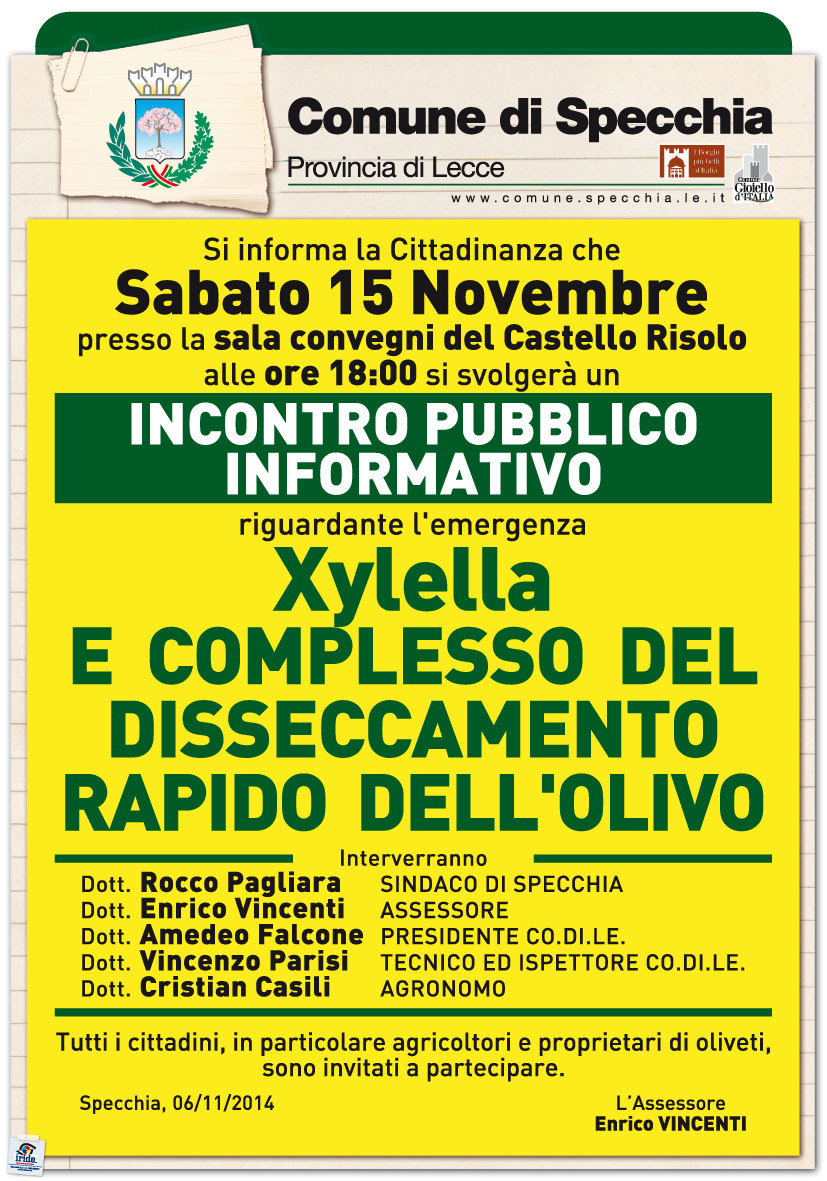 INCONTRO INFORMATIVO PUBBLICO SULLA XILELLA E SUL COMPLESSO DEL DISSECCAMENTO RAPIDO DELL'OLIVO -