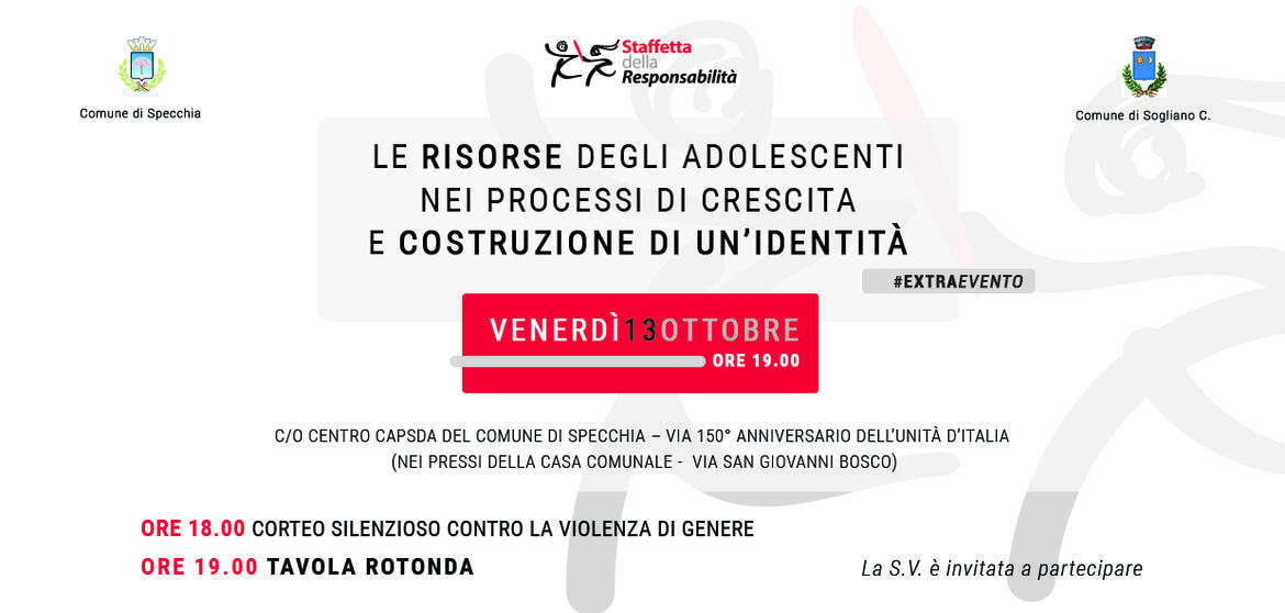 Per ricordare la memoria di Noemi, ad un mese dalla sua scomparsa, il Comune di Specchia organizza per venerdì 13 ottobre un evento di informazione, formazione e sensibilizzazione sui temi della violenza di genere. In collaborazione con la Staffetta della Responsabilità, progetto ideato dal Comune di Sogliano Cavour, si terrà alle ore 18.00 un corteo silenzioso (che partirà da via 150° Anniversario dell’Unità d’Italia, nei pressi della Casa Comunale - via San Giovanni Bosco c/o Centro Capsda) che farà da apertura alla tavola rotonda dal titolo “Le risorse degli adolescenti nei processi di crescita e costruzione di un’identità”, con inizio previsto per le ore 19.00 presso il Centro CAPSDA del Comune di Specchia.