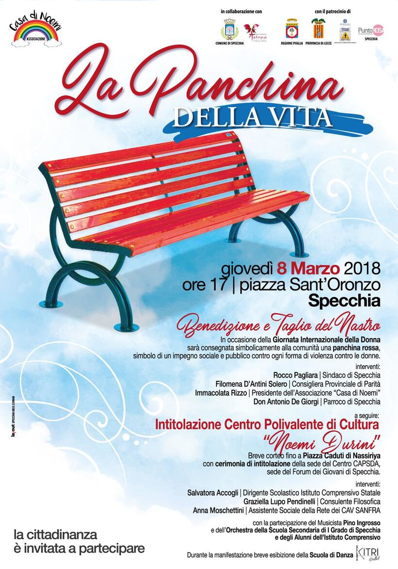 Descrizione In occasione della Giornata Internazionale della Donna, verrà consegnata simbolicamente alla comunità una panchina rossa, simbolo di impegno sociale contro la violenza sulle donne Galleria immagini IMG 20180303 WA0007