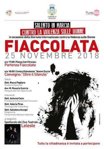 PROPRIO PER QUESTO HA ACCOLTO L'INVITO DELLA DELLA PROVINCIA ORGANIZZANDO PER IL 25.11.2018 UNA FIACCOLATA CHE SI SVOLGERA' PRESSO LE VIE DEL PAESE A PARTIRE DA PIAZZA SANT' ORONZO SINO A RAGGIUNGERE IL CENTRO POLIVALENTE "NOEMI DURINI" SITO IN VIA XXV APRILE, DOVE A SEGUIRE ALLE ORE 18.00 E' PREVISTO UN INCONTRO DENOMINATO "OLTRE IL SILENZIO" SULLA TEMATICA CON L'INTERVENTO DELLE OPERATRICI DEL C.A.V. "PUNTO ROSA" DI SPECCHIA E CON LA DIRIGENTE DELL'ISTITUTO COMPRENSIVO ALESSANO - SPECCHIA