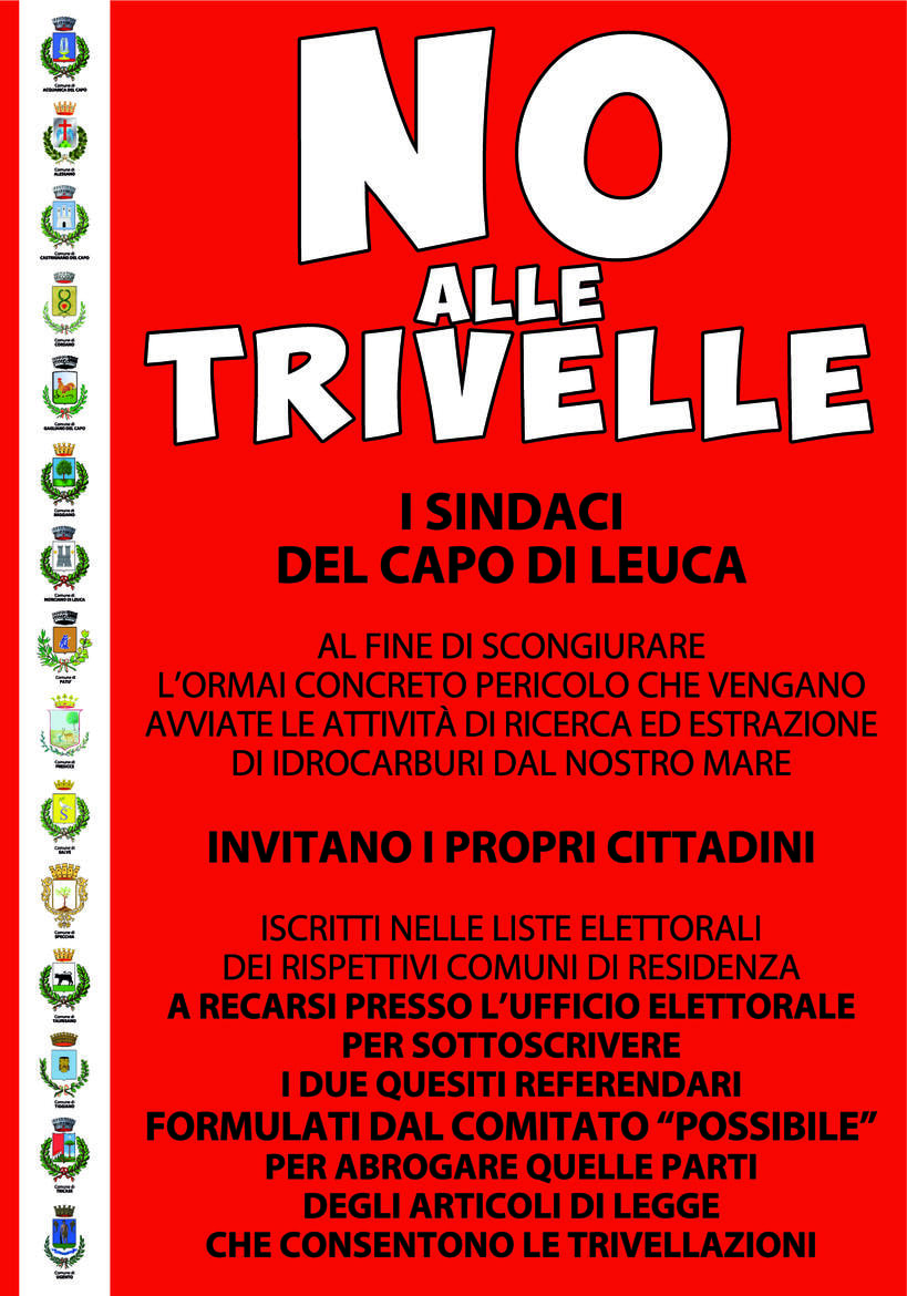 E' STATA AVVIATA LA CAMPAGNA A LIVELLO NAZIONALE PER SOTTOPORRE A REFERENDUM POPOLARE 8 QUESITI TRA CUI L'ELIMINAZIONE DELLE TRIVELLAZIONE IN MARE E PER L'ELIMINAZIONE DEL CARATTERE STRATEGICO DELLE TRIVELLAZIONI.