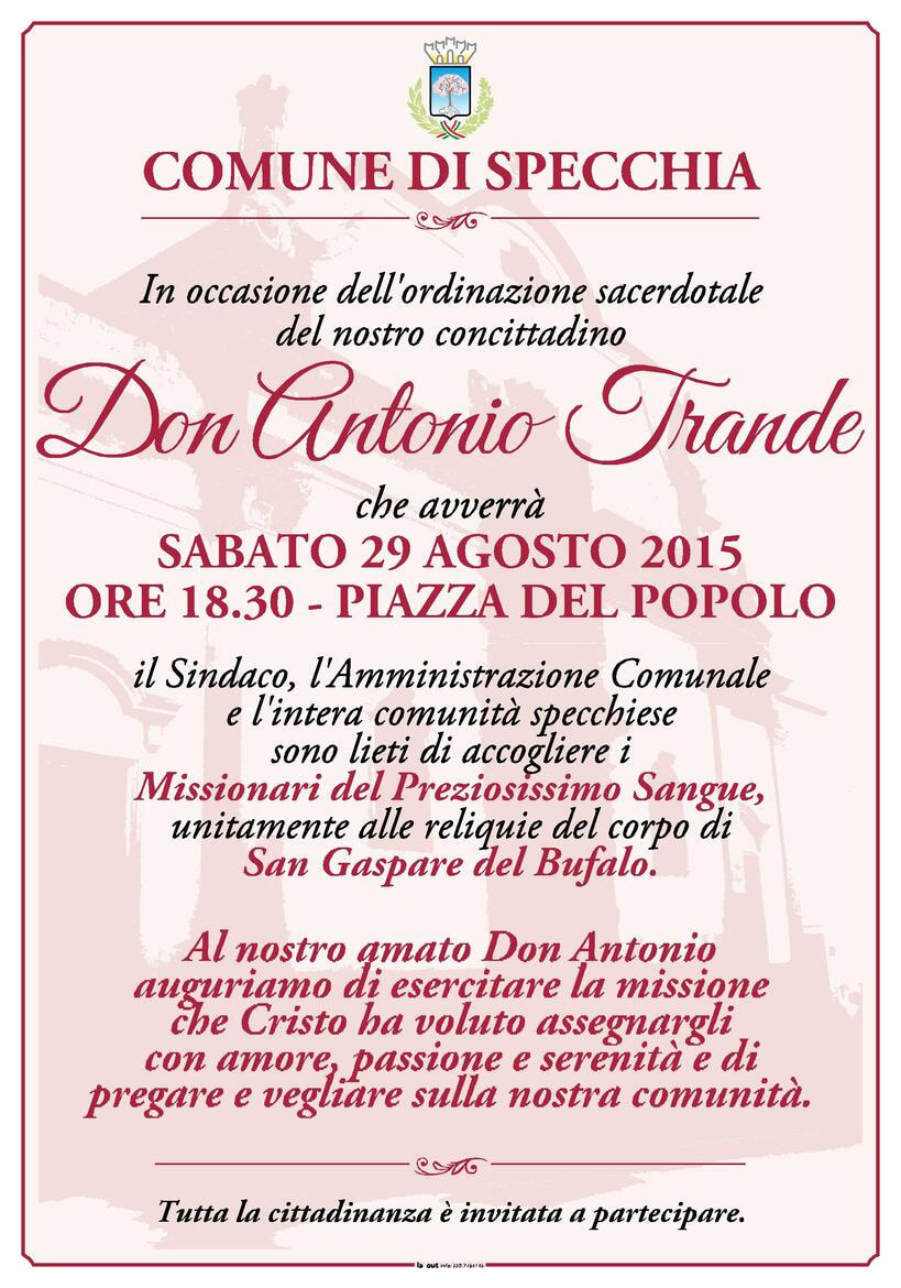 ORDINAZIONE SACERDOTALE DEL NOSTRO CONCITTADINO DON ANTONIO TRANDE - SABATO 29 AGOSTO 2015 IN PIAZZA DEL POPOLO ALLE ORE 18.30