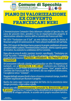 L'Amministrazione comunale è lieta di informare i cittadini di Specchia, che nei prossimi mesi, prenderà il via un importantissimo progetto di valorizzazione culturale e turistica del Convento dei Francesca Neri.