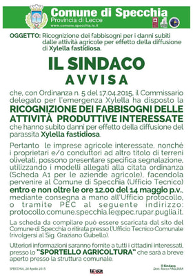 Ai fini della determinazione del fabbisogno necessario per gli interventi relativi alle attività economiche e produttive del territorio salento, al presente avviso possono rispondere i titolari di attività economiche e produttive interessate compilando le allegate schede per la ricognizione nelle aziende agricole della consistenza di piante infette o con sintomi da Xylella fastidiosa e dei danni subiti.