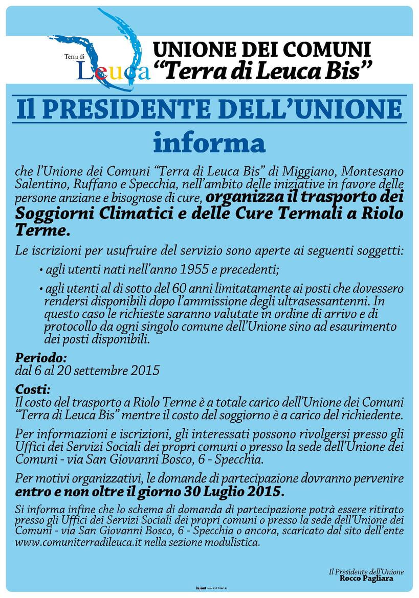SOGGIORNI CLIMATICI E CURE TERMALI A RIOLO TERME - ORGANIZZAZIONE DEL SERVIZIO DI TRASPORTO DA PARTE DELL'UNIONE DEI COMUNI TERRA DI LEUCA BIS