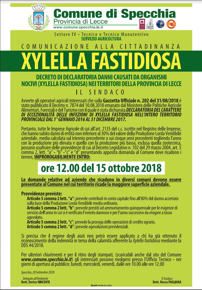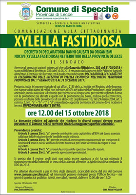 DECLARATORIA DEL CARATTERE DI ECCEZIONALITÀ DELLE INFEZIONI DI XYLELLA FASTIDIOSA NELL’INTERO TERRITORIO PROVINCIALE DAL 1° GENNAIO 2016 AL 31 DICEMBRE 2017.
